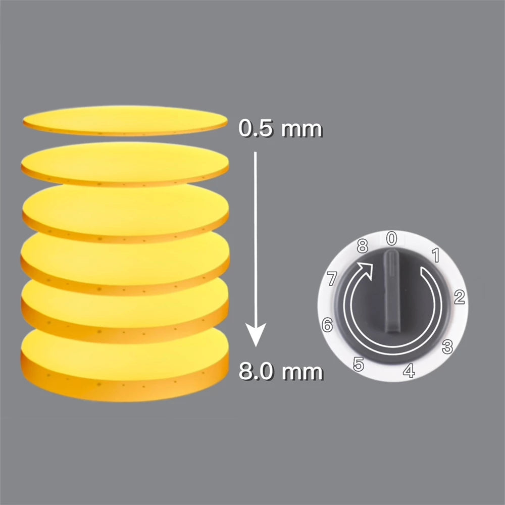 [Multifunktionel] Knivene giver fleksibilitet til nemt at skære, snitte, strimle, hakke frugt og grøntsager i forskellige former og størrelser. Du kan f.eks. nemt skære en kartoffel i bølgede eller normale skiver, strimler eller mose den.